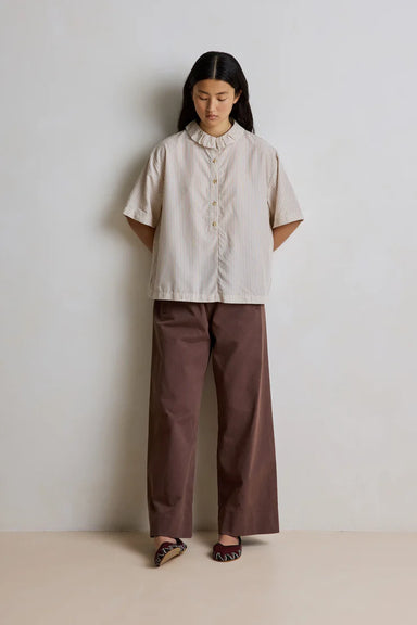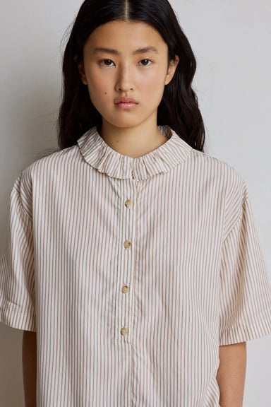 This gorgeous little blouse is made from the finest cotton. In a caramel stripe with a frill collar - it has a half placket. Super lightweight an...