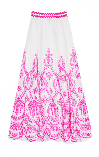 The midi length Alexandra skirt is made of luminous white cotton, adorned along the entire lower part of the skirt with stunning neon pink broderie...