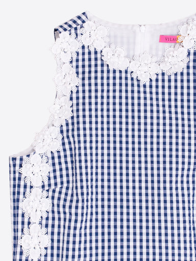 Embrace effortless summer style with this super cute Vilagallo seersucker top. The navy and white seersucker fabric is edged with floral appliqué d...