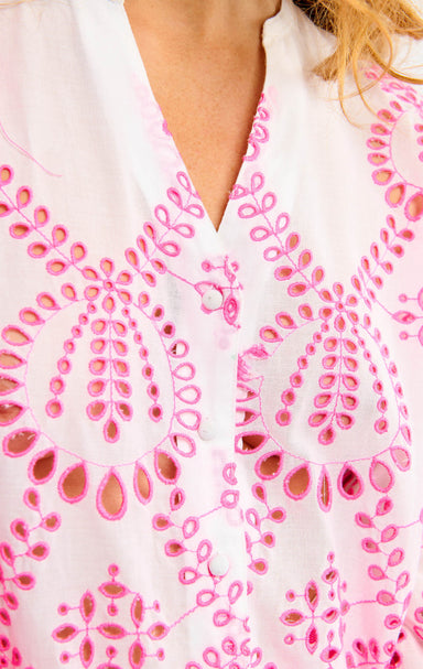 This stunning, broderie anglaise blouse is a knock out piece. Made from 100% cotton it has a scalloped hem and ric rac detailing on the cuff. The...