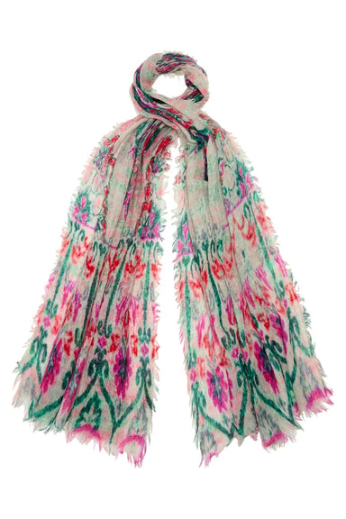 Vibrant pops of emerald, crimson and fuchsia calmed by a neutral backdrop make this scarf a wonderful palette of uplifting colours to elevate any l...