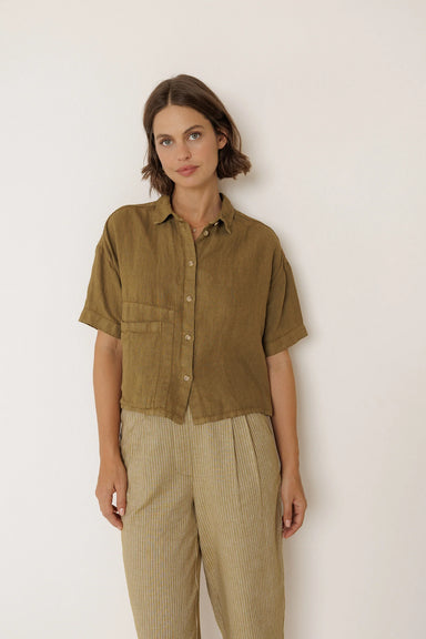 Loving this little shirt! It has a boxy fit and one patch pocket. Wear buttoned up or undone with a t shirt or vest underneath. It has short slee...