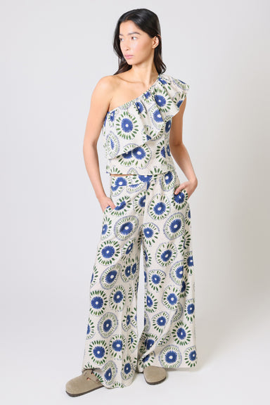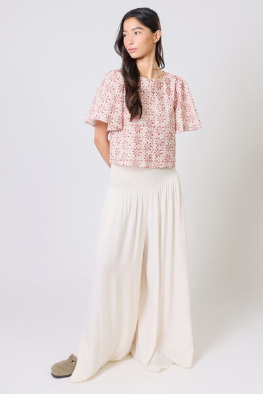 Such a pretty print - these wide legged trousers have side pockets with a flat front waistband with smocked elastic at the back giving a great find...