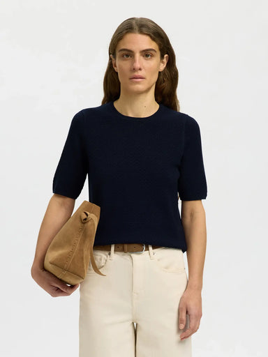 This sweet cotton mix knit. Has a short sleeve and scalloped neck line. It's textured with some cable detailing to give an elevated look. Hemmed...