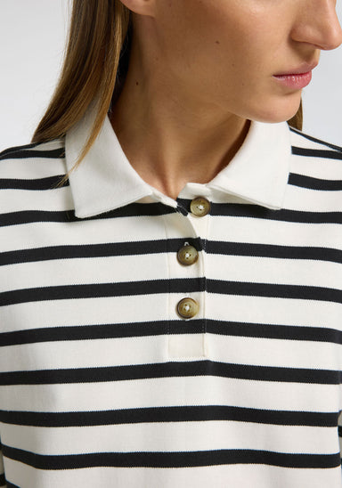 This short-sleeved knit polo features a fine striped pattern, classic collar and button placket with contrasting details. The soft knit quality off...