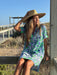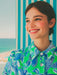 This sweet shirt dress has a tropical print in vibrant greens and blues. It has short sleeves, a classic collar and two chest pockets with decorative buttons - super cute!