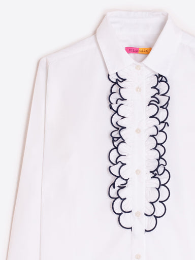 Strikingly simple but wow! This adorable white poplin shirt with vertical ruffles and a navy blue embroidered edge is a classic with a definite twi...
