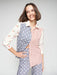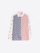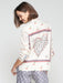Such a cool blouse! Straight cut with contrasting geometric prints. One sleeve is printed with cherries and the other with handwriting.