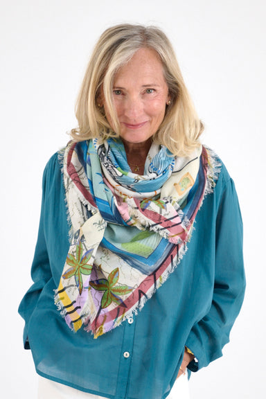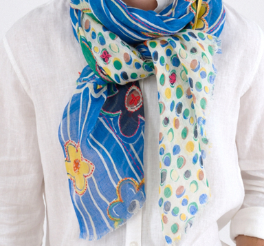 A beautiful scarf from French brand Storiatipic. A palette of soft and more vibrant blues ensure this scarf looks fabulous against this summer's ...