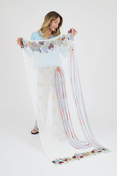 A fresh white linen scarf with beautiful embroidery details along the border. The cactus theme is a novel design and the colours rather striking t...